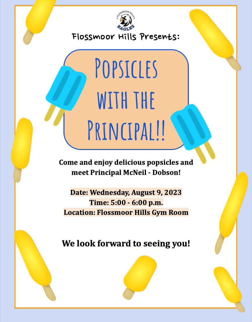 Stop by for a quick meet and greet with the new Flossmoor Hills Principal Evita McNeil-Dobson. Wednesday, August 9, 2023, 5:00-6:00 p.m. in the Flossmoor Hills Gym Room.